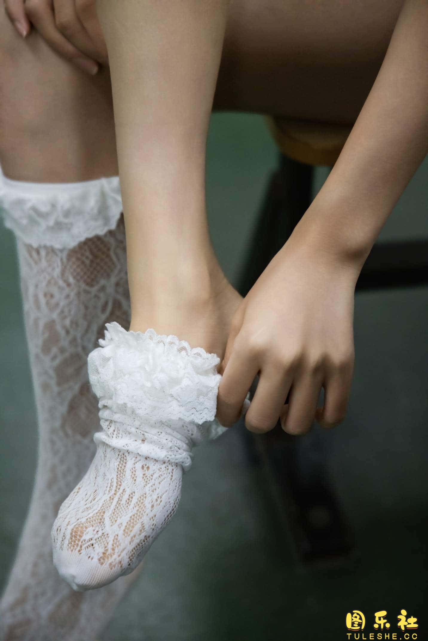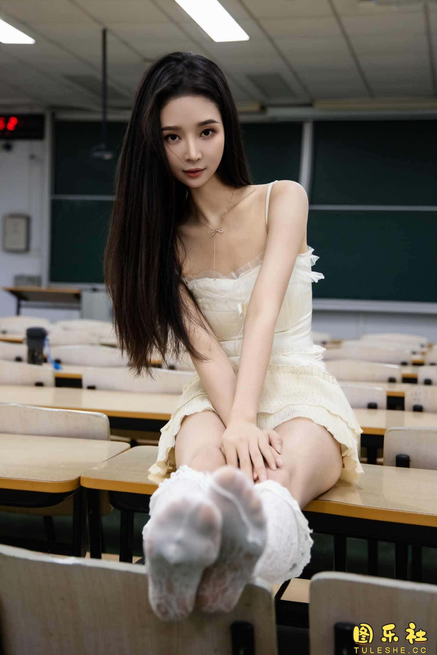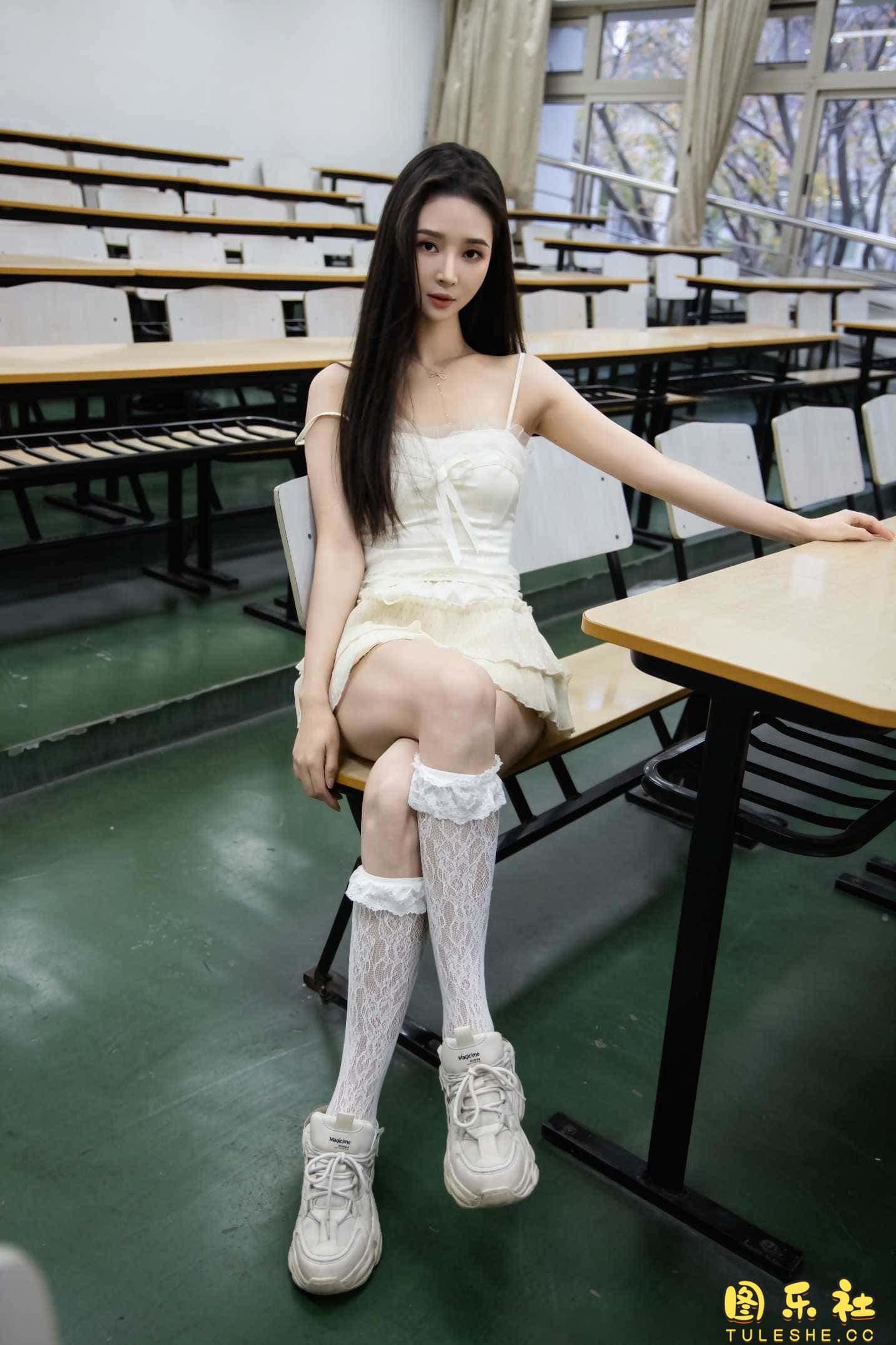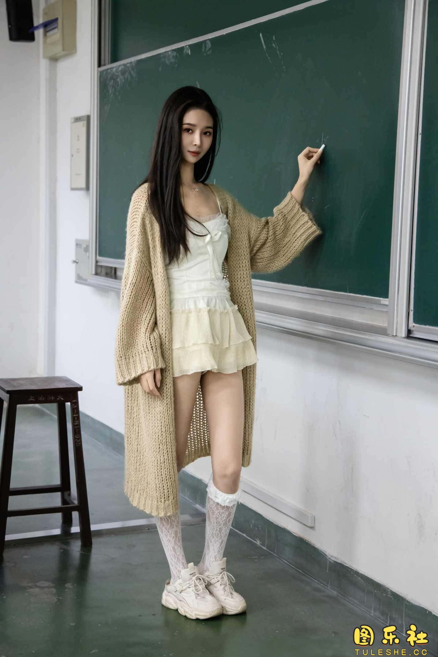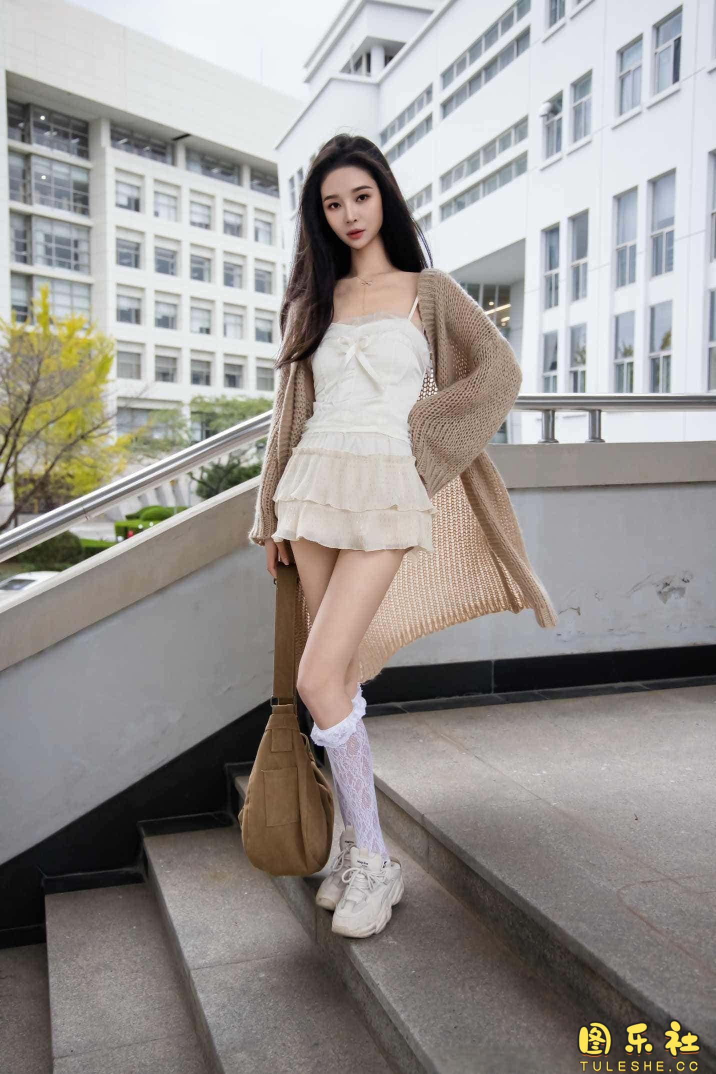 搭配:针织长衣、白色吊带、运动鞋、白色丝袜、裸足