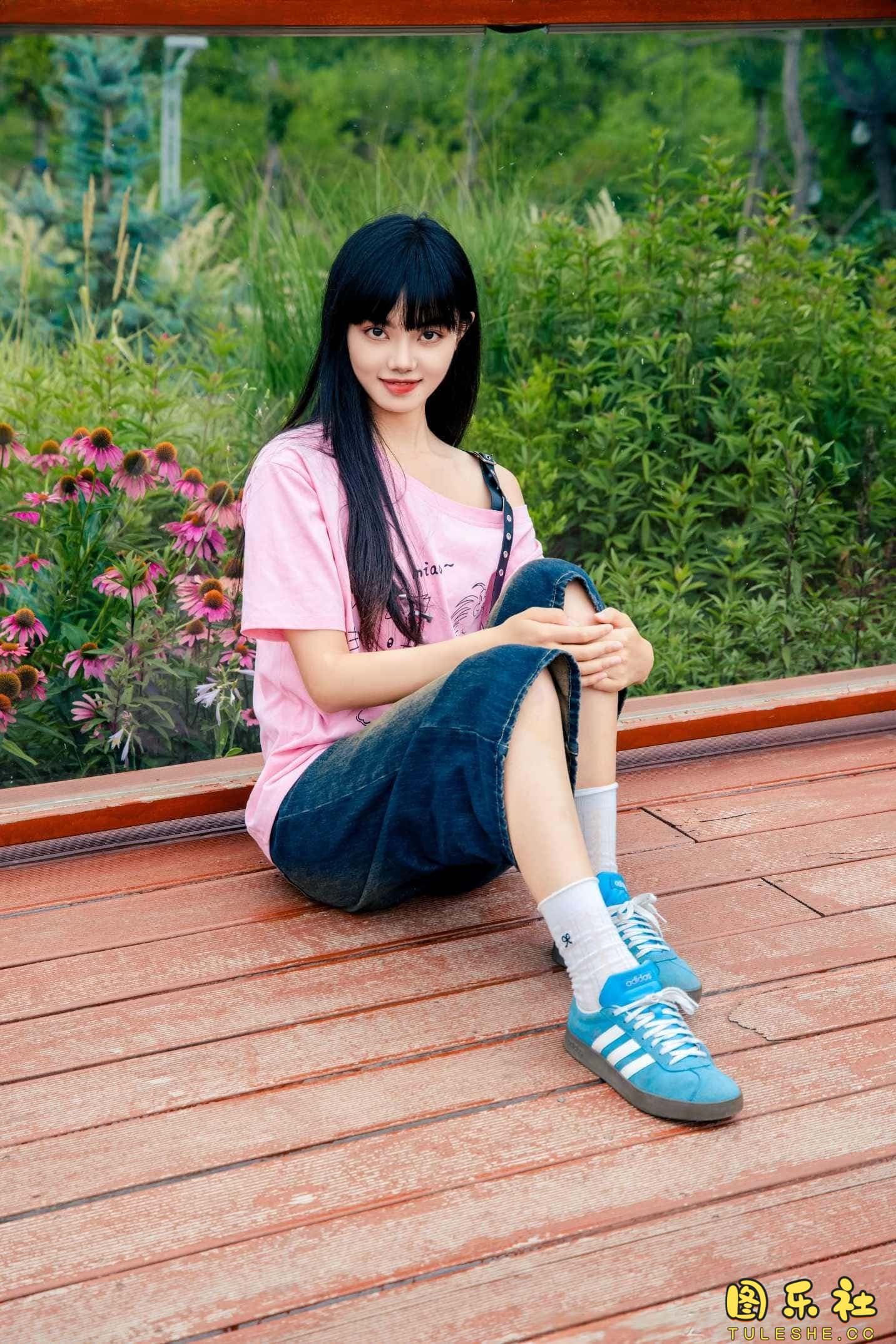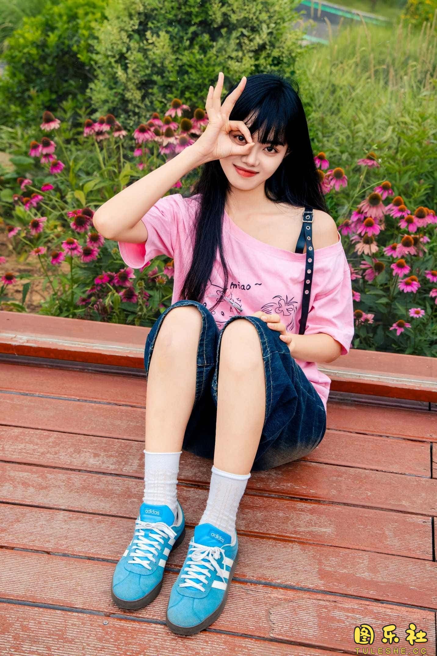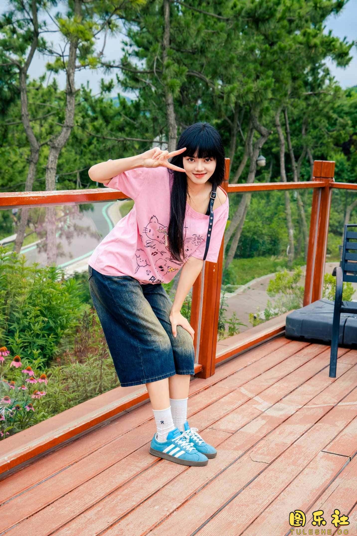 搭配:粉色T恤、牛仔短裤、白棉袜、德训鞋、裸足